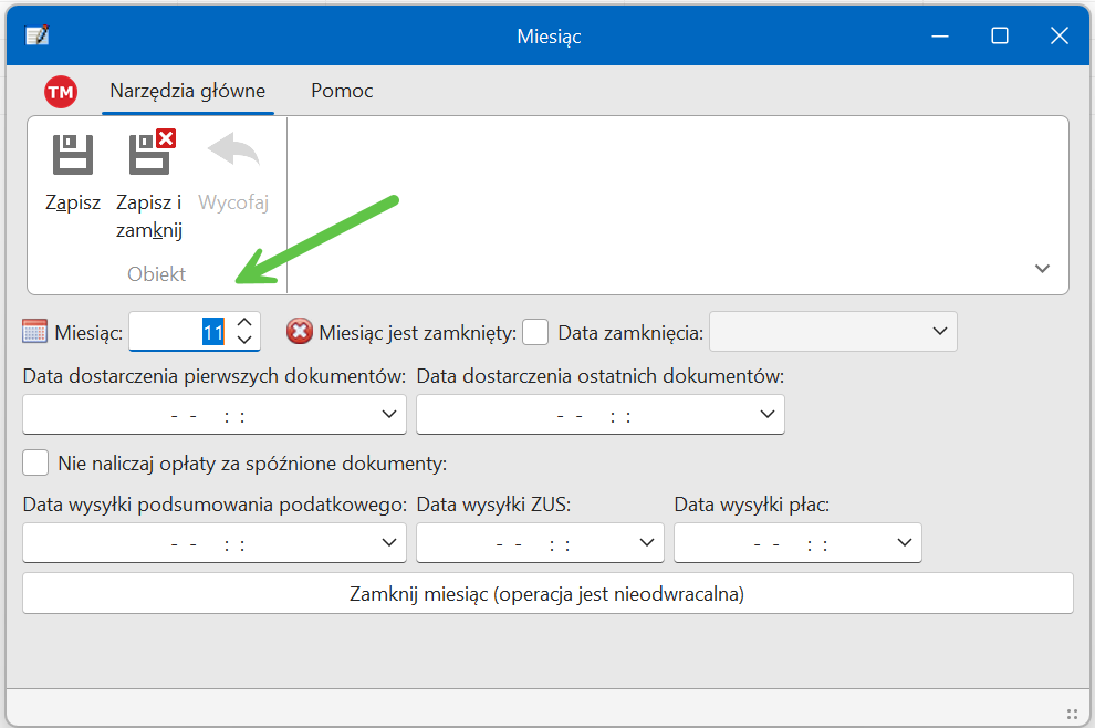 Następnie należy podać miesiąc (domyślnie 1 lub następny po ostatnio dodanym) i kliknąć "Zapisz i zamknij". Na poniższym ekranie pokazano dodawanie listopada, niektóre opcje nie są dostępne we wszystkich wersjach programu.