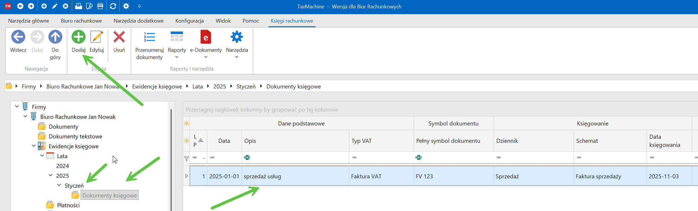 Księgowanie dokumentów odbywa się pod węzłem "Dokumenty księgowe" po rokiem i miesiącem księgowym. Kliknięcie "Dodaj" lub + na klawiaturze numerycznej rozpoczyna edycję nowego dokumentu w buforze: