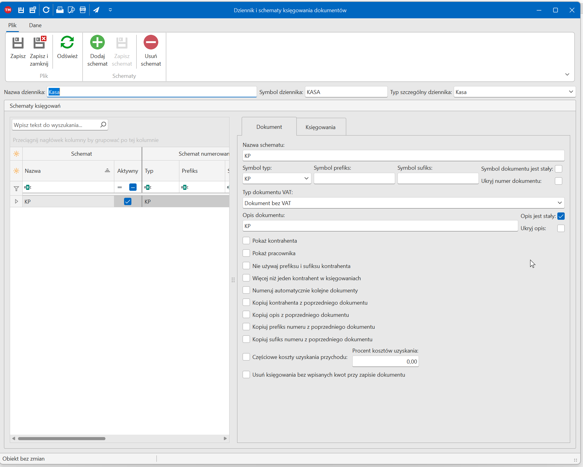 Do najważniejszych opcji schematu należą tez związane z konfiguracją okna edycji dokumentu księgowego, w tym widoczność kontrahenta, stosowanie zapamiętanych dla kontrahenta prefiksów i sufiksów w numerach faktur, kopiowanie kontrahenta z poprzedniego dokumentu (przyspiesza wprowadzanie dokumentów jeżeli kontrahenci się powtarzają), kopiowanie opisu z poprzedniego dokumentu, czy stosowanie rozliczania kosztów przy częściowym odliczaniu od kosztów uzyskania przychodu.