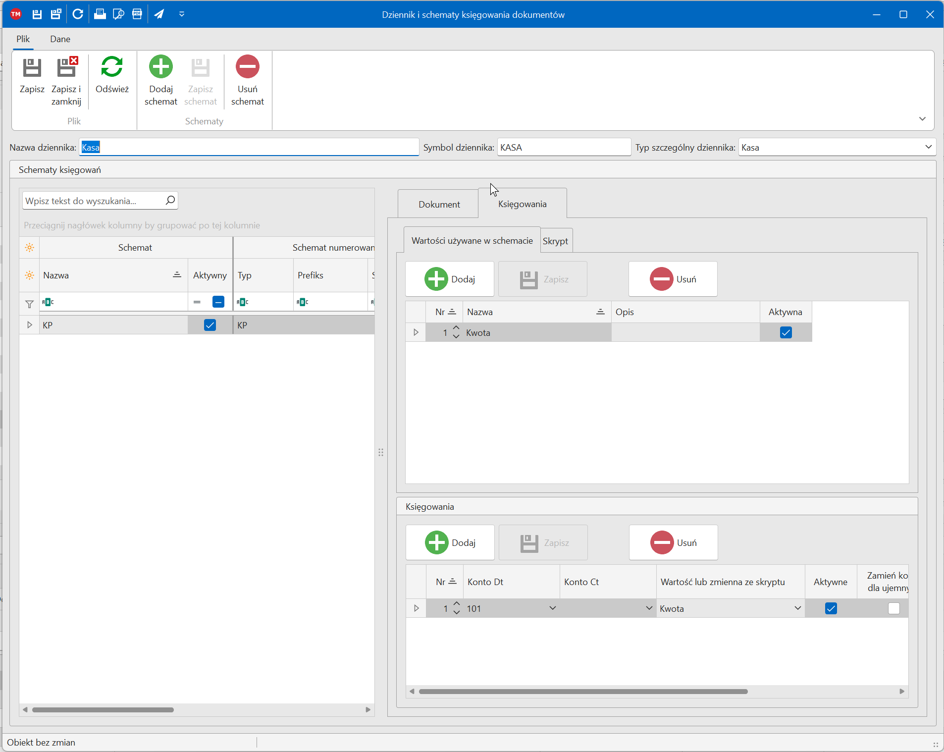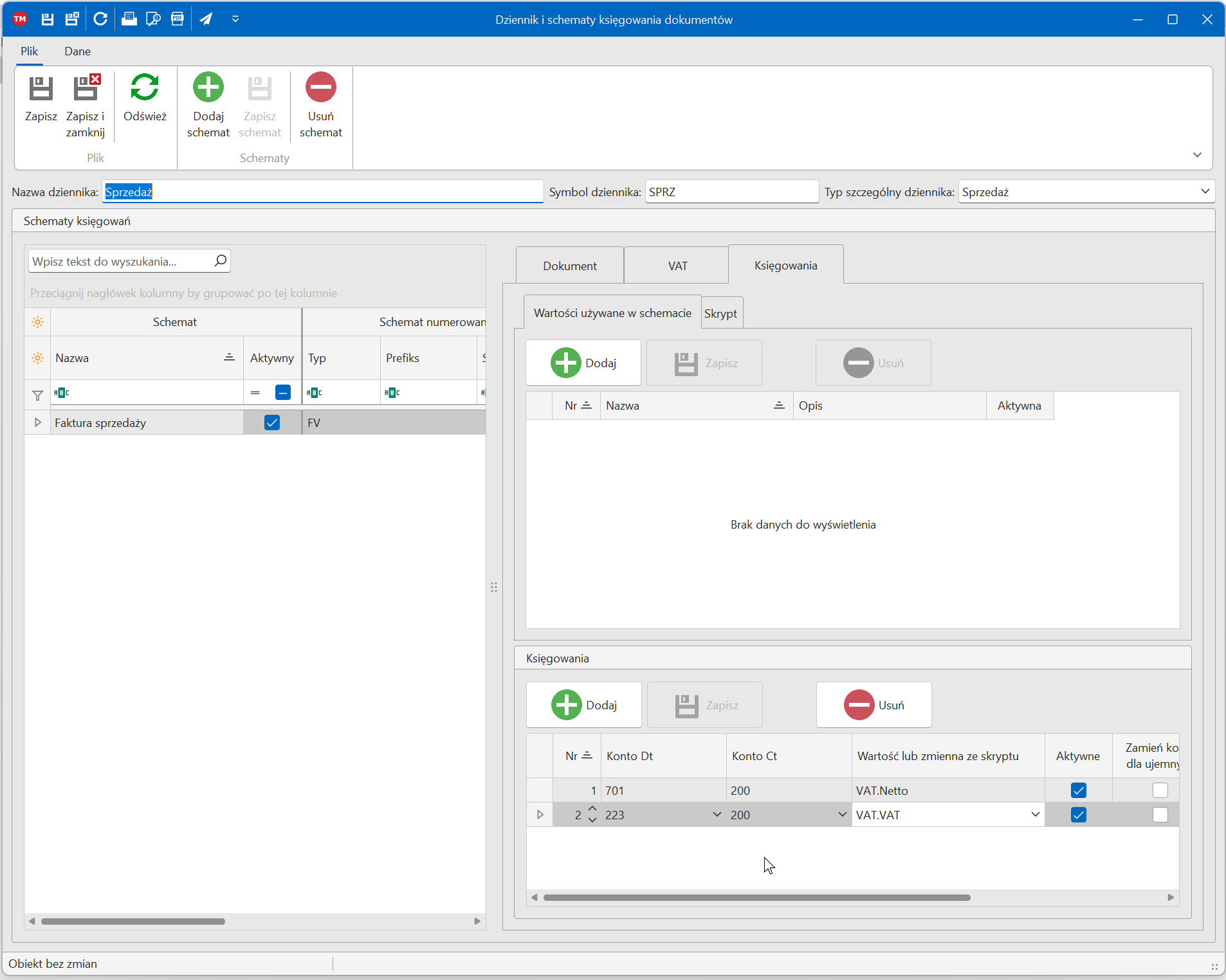 Na zakładce "Księgowania" definiuje się księgowania schematu. Można zdefiniować wartości (używane potem w księgowaniach) i same księgowania.