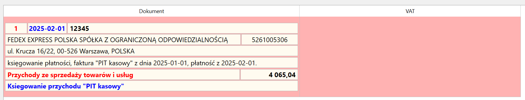 Tak zaksięgowany dokument wykazywany jest w kwocie netto od kwoty płatności z datą płatności. Kwota przychodu wynikająca z płatności wpisana została do kolumny określonej w pierwotnym dokumencie. Dla ryczałtu zastosowana zostanie stawka jak w pierwotnym dokumencie. Jeżeli na pierwotnej fakturze jest więcej niż jedna stawka ryczałtu to automatyczne księgowanie płatności trzeba będzie skorygować. Inną opcją dla ryczałtu w takim przypadku jest księgowanie pierwotnej faktury w osobnych pozycjach według stawek ryczałtu.