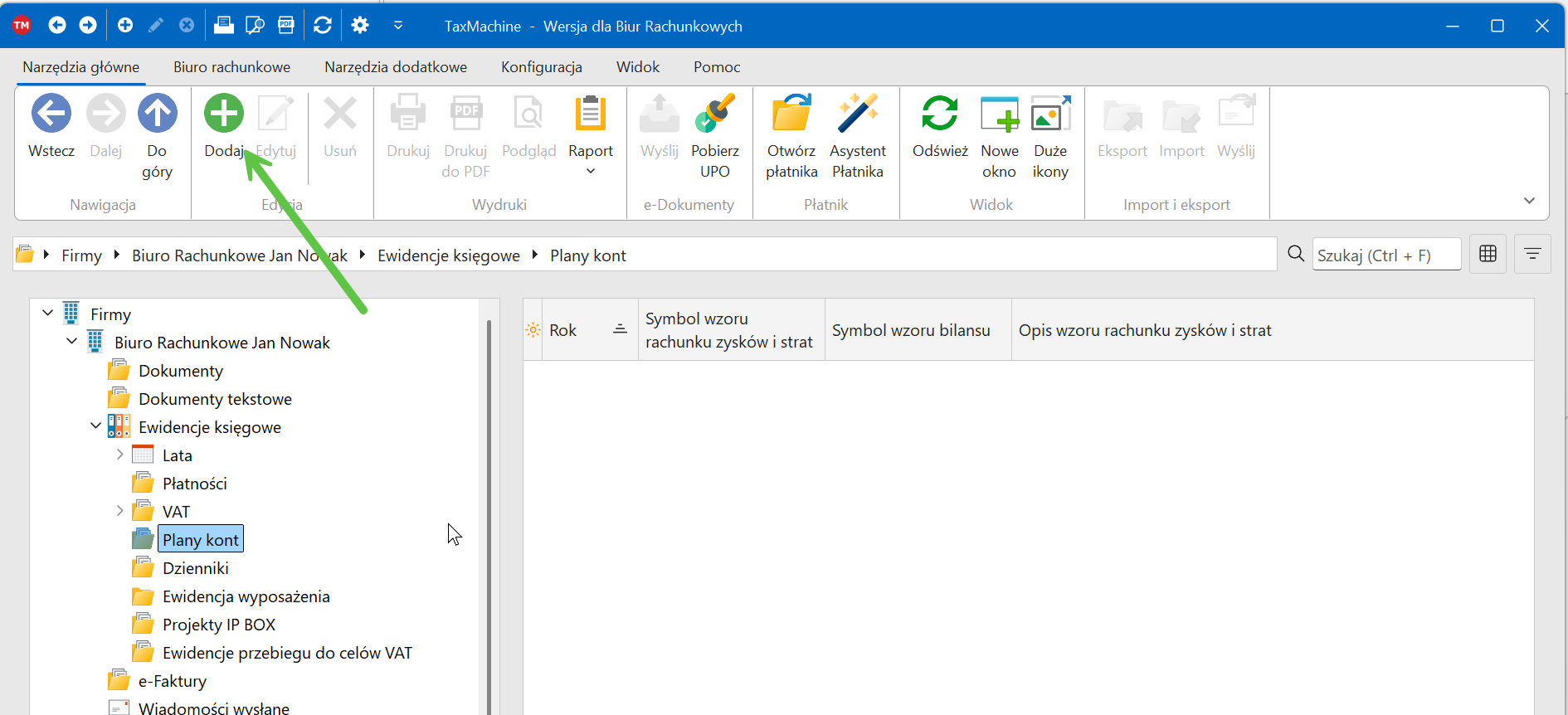 Zakładanie planu kont, klikamy "Dodaj" na "Plany kont":