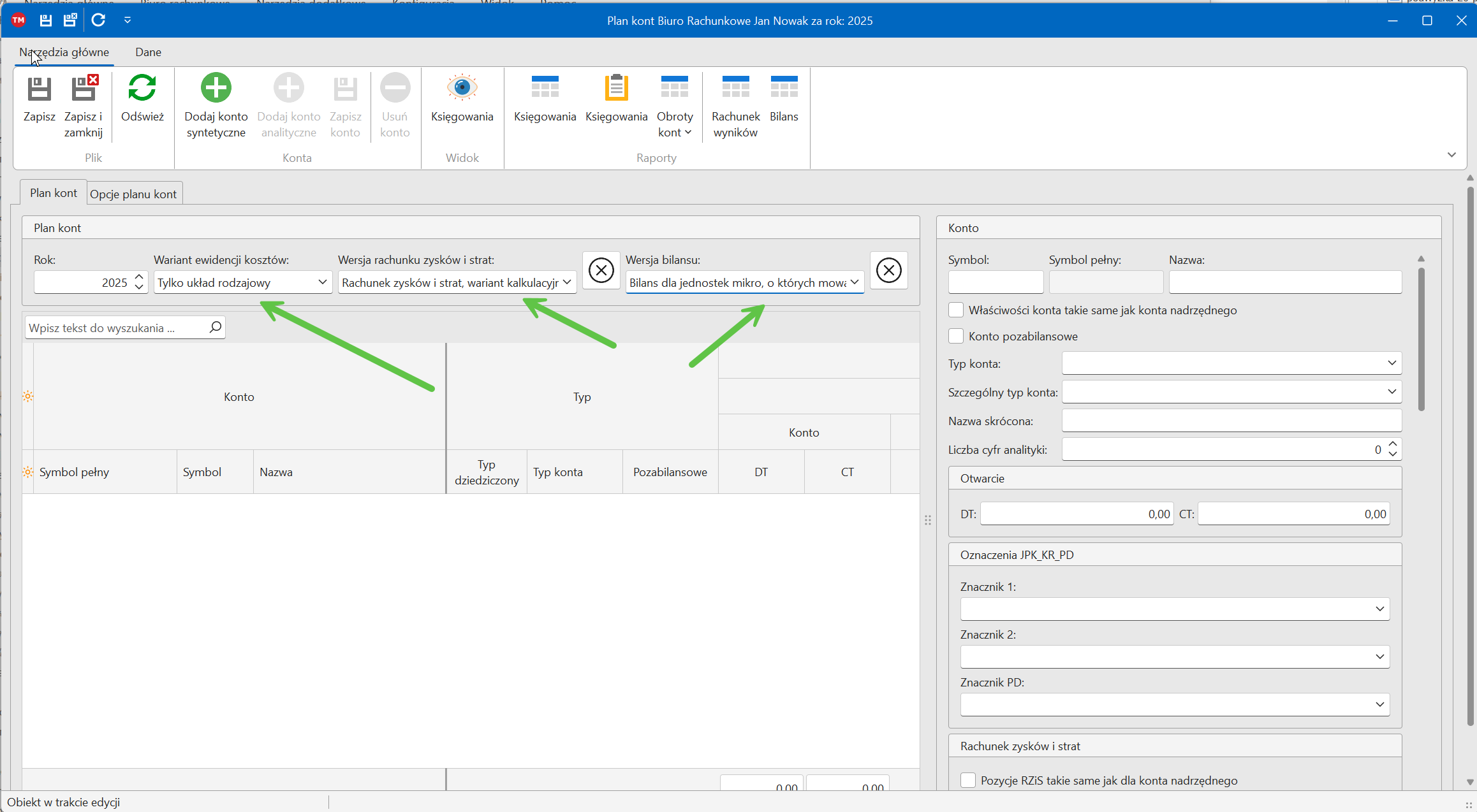 UWAGA: edycja planu kont nie jest możliwa dla planów powiązanych z zamkniętym rokiem obrotowym.