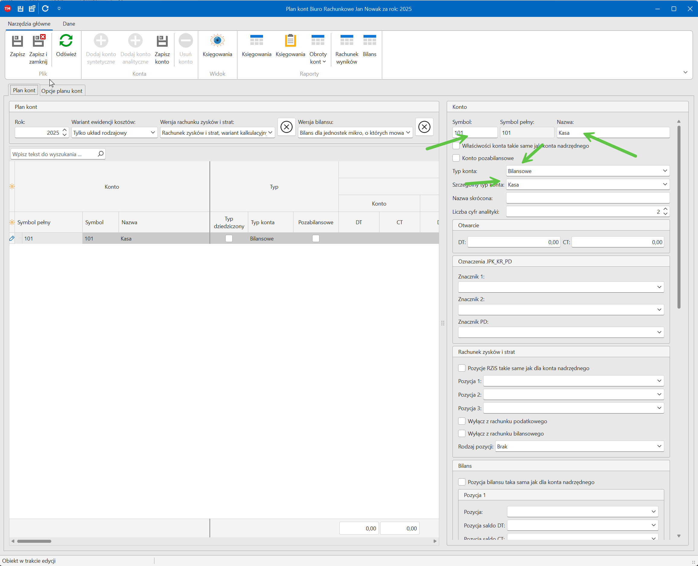 Poniżej pokazano dodawanie konta 101 "Kasa", należy podać symbol, nazwę typ konta, szczególny typ konta jeżeli dotyczy. Podaje się też oznaczenia JPK_KR_PD, pozycję w RZiS i bilansie. Można też określić rodzaj grupowanych kontrahentów dla kont syntetycznych kontrahentów. Konta analityczne dodaje się podobnie, ale najpierw należy wskazać zdefiniowane wcześniej konto syntetyczne i kliknąć "Dodaj konto analityczne", następnie podać symbol i nazwę. Konta analityczne standardowo dziedziczą ustawienia konta syntetycznego.