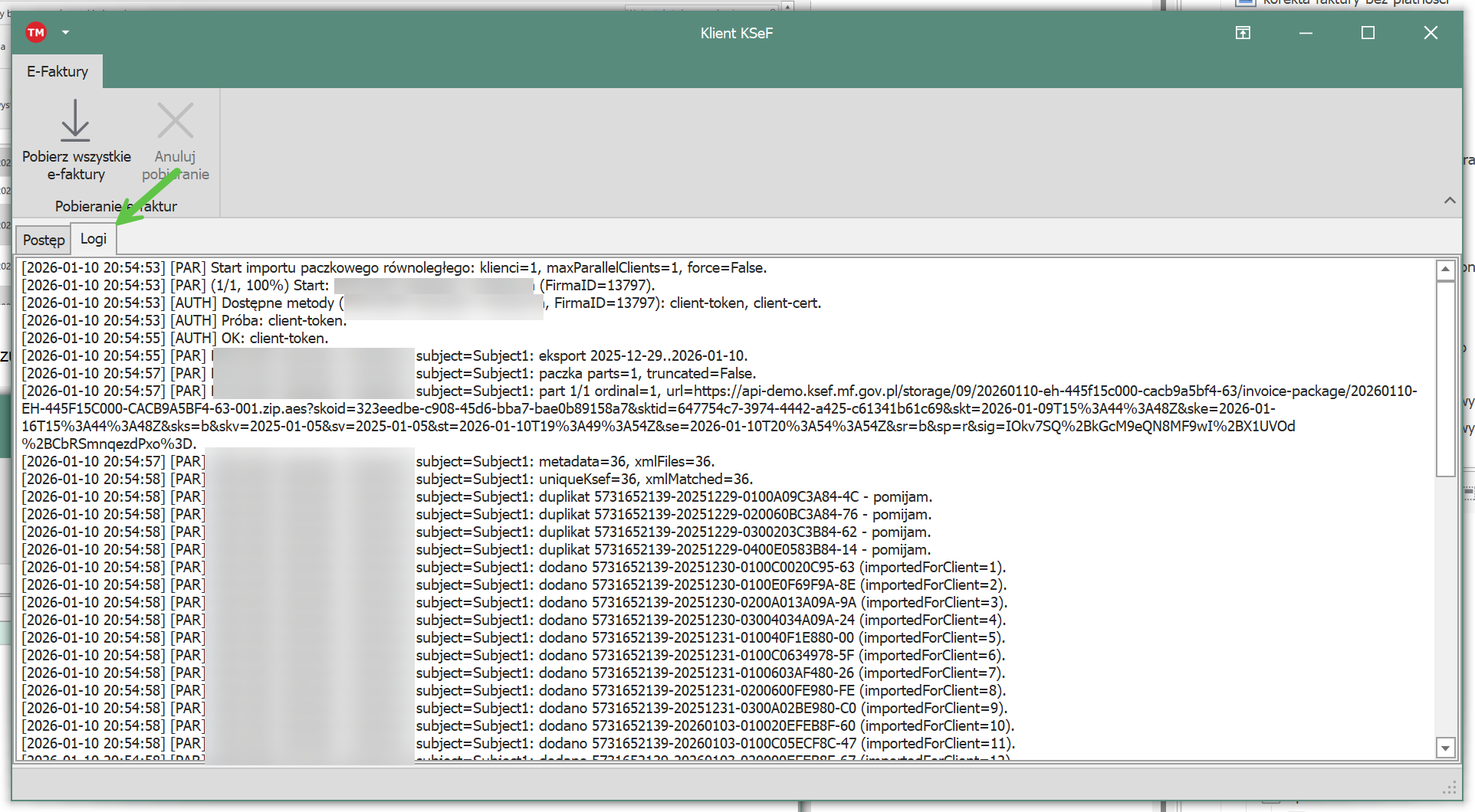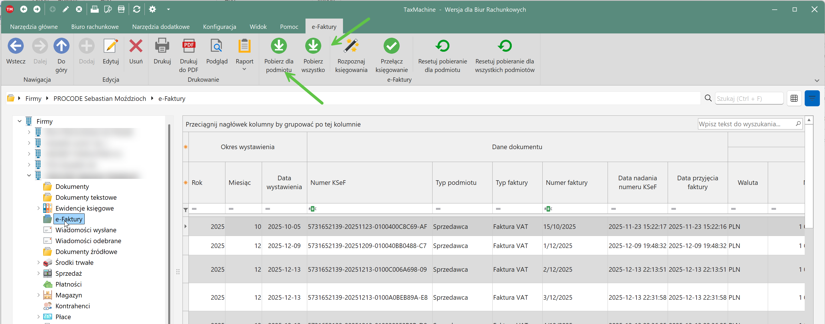 Pierwsza opcje pobiera wszystkie nowe e-faktury dla bieżącego podmiotu, druga jest przydatna jeżeli chcemy uruchomić pobieranie dla wszystkich podmiotów w programie.