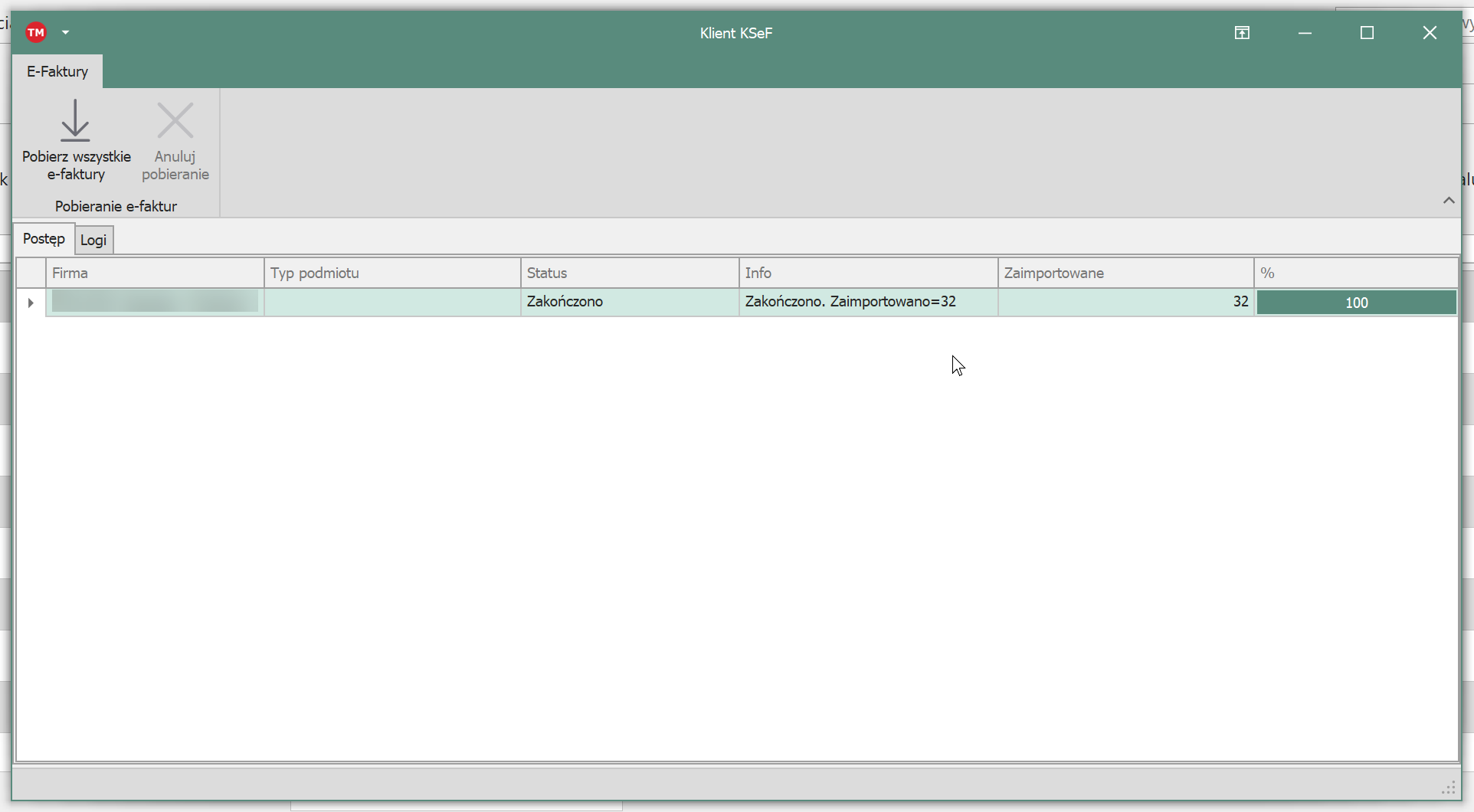 Otwiera się wówczas okno klienta KSeF, który od razu rozpoczyna sprawdzanie dostępności nowych faktur do pobrania. Poniżej pobrano 32 e-faktury: