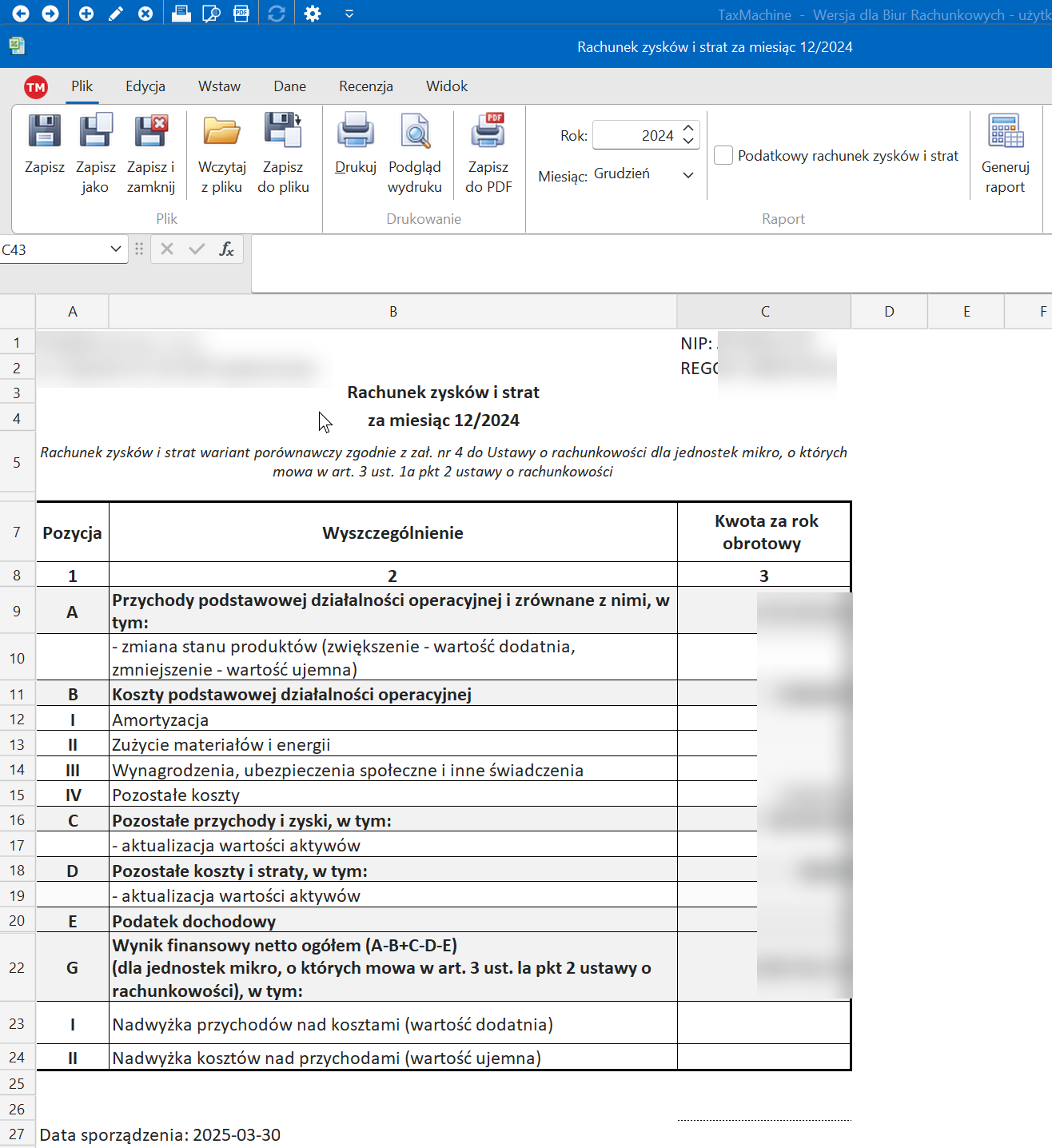 Księgi rachunkoweSprawozdawczość Rachunek zysków i strat Rachunek zysków i strat generowany jest z pozycji "Raporty" na wstążce kontekstowej "Księgi rachunkowe" dla dokumentów księgowych. Przykładowy RZiS dla jednostki mikro: