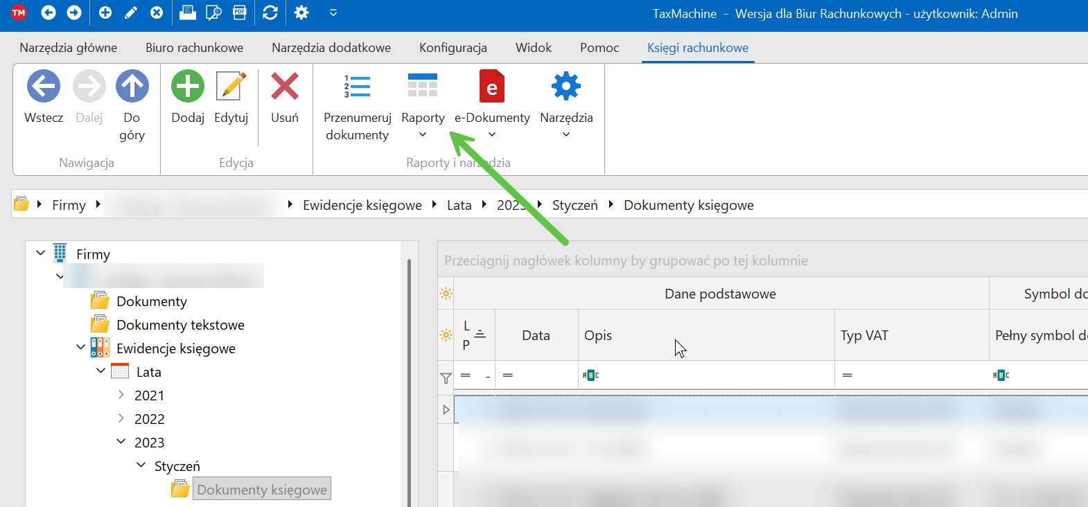 Raporty dla ksiąg rachunkowych tworzy dostępne są z pozycji "Raporty" na wstążce kontekstowej "Księgi rachunkowe" dla dokumentów księgowych.