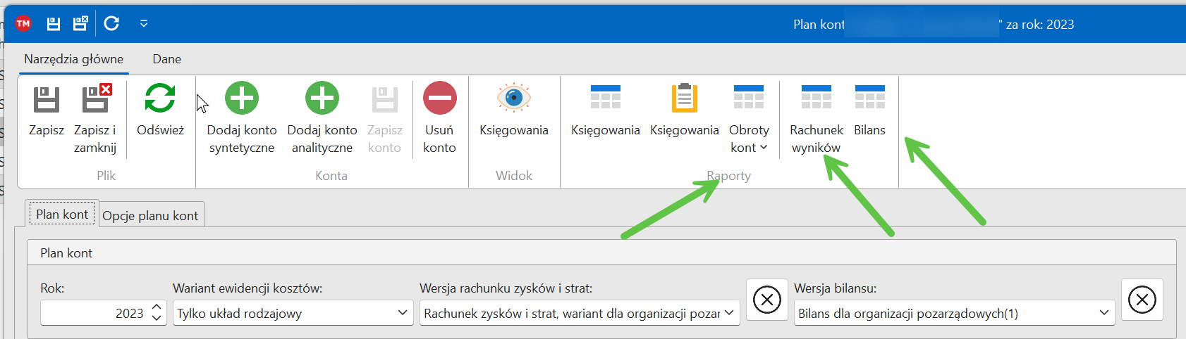 Raporty z księgowaniami na koncie lub kontach można także tworzyć bezpośrednio w oknie edycji planu kont: